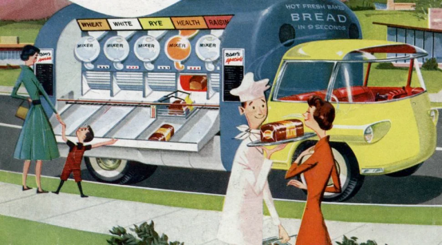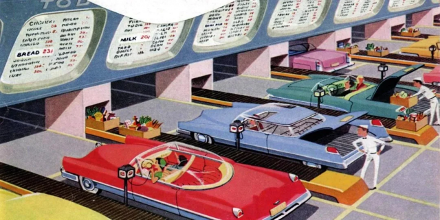 Как в 1950-х представляли следующее десятилетие. Продуктовый магазин, работающий навынос как Макдональдс.