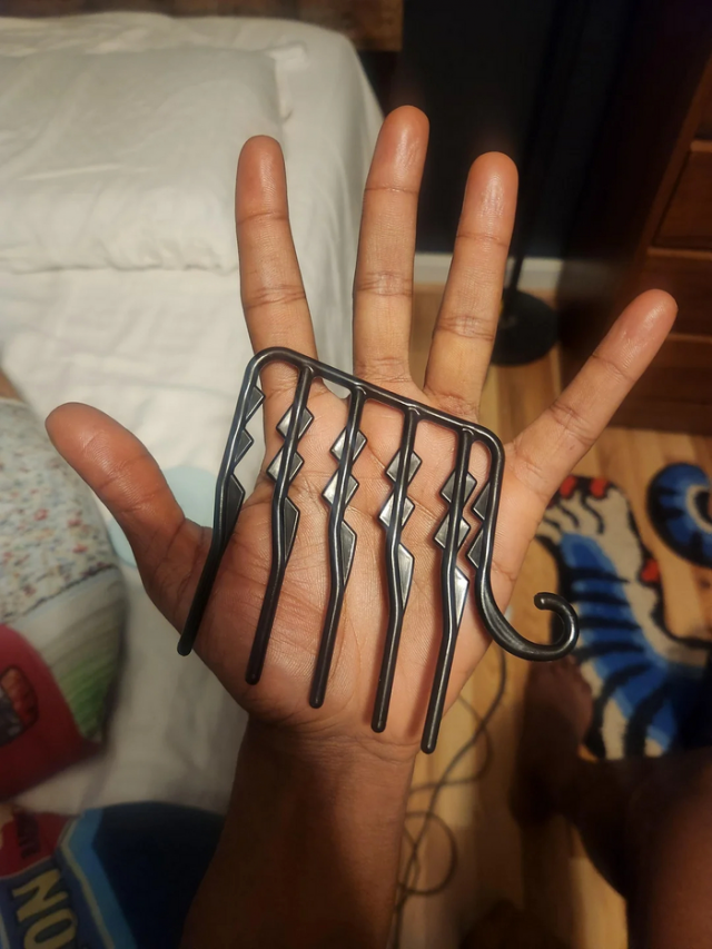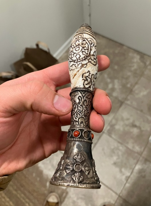 «Я нашёл эту штуку в комиссионном магазине. Кажется, она сделана из кости, серебра и камней. Очень тяжёлая»