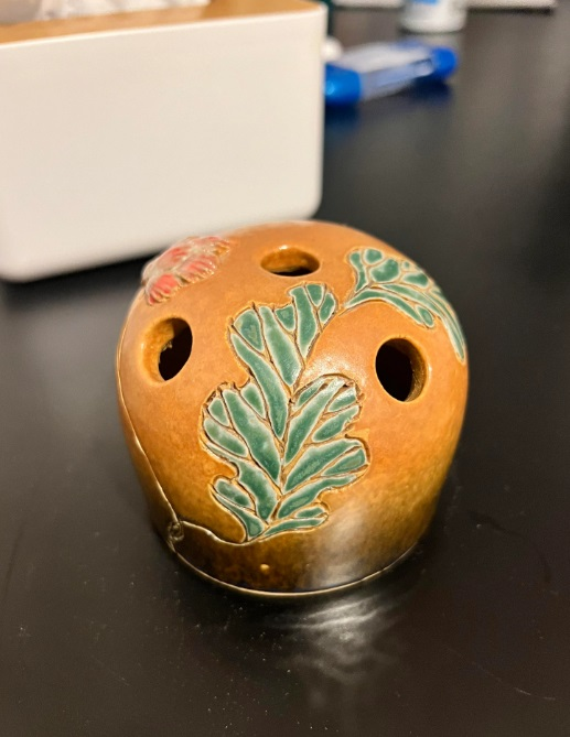 Это ваза с множеством отверстий для цветов — «цветочная лягушка».