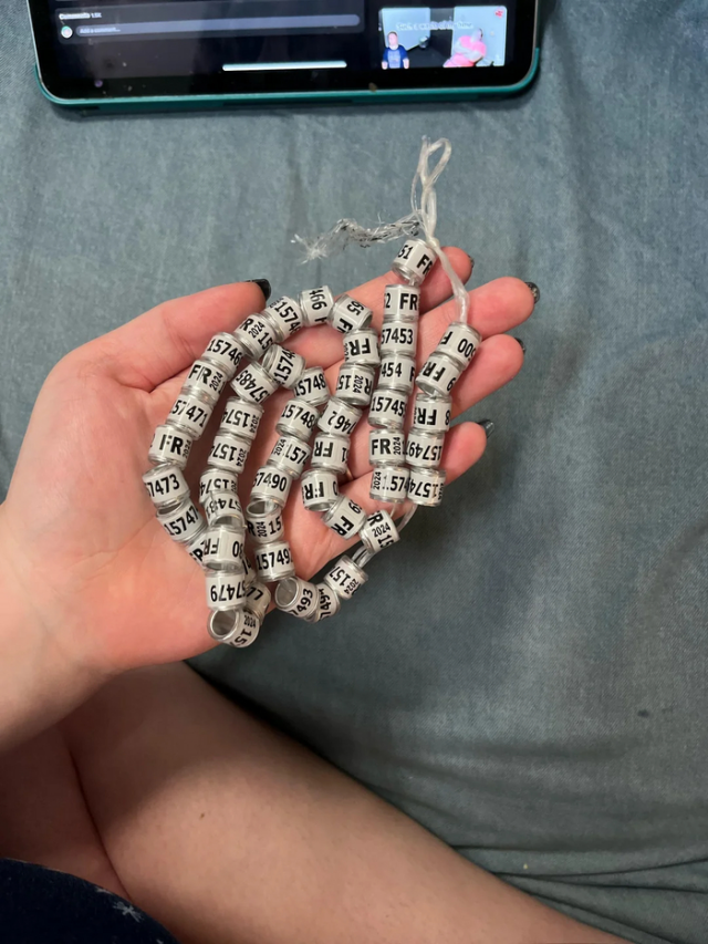 «Получил это по почте. Круглые кольца на верёвке? Кажется, что они сделаны из алюминия и пластика, с уникальными идентификационными номерами на каждом кольце»