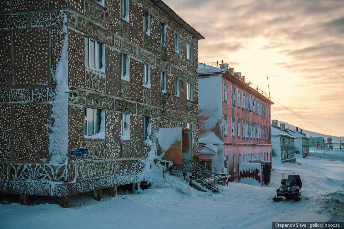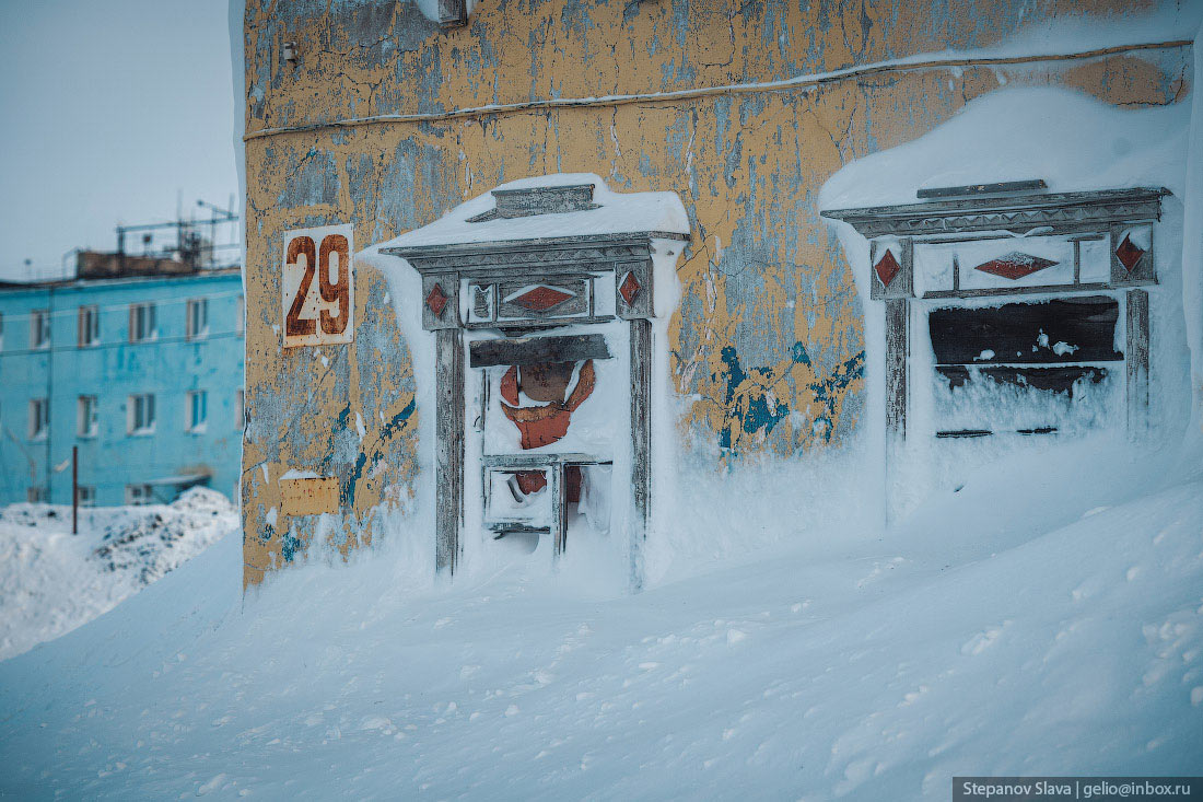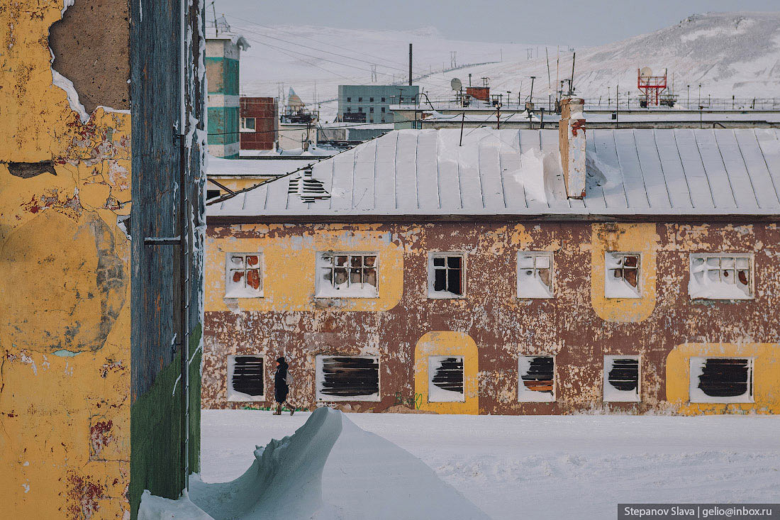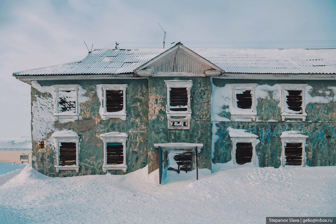 28. Самый сложный период пришелся на 90-е годы: порт переживал трудные времена, многие жители покинули посёлок, большая часть военных также ушла. В Тикси есть заброшенные здания — многие из них расселены.