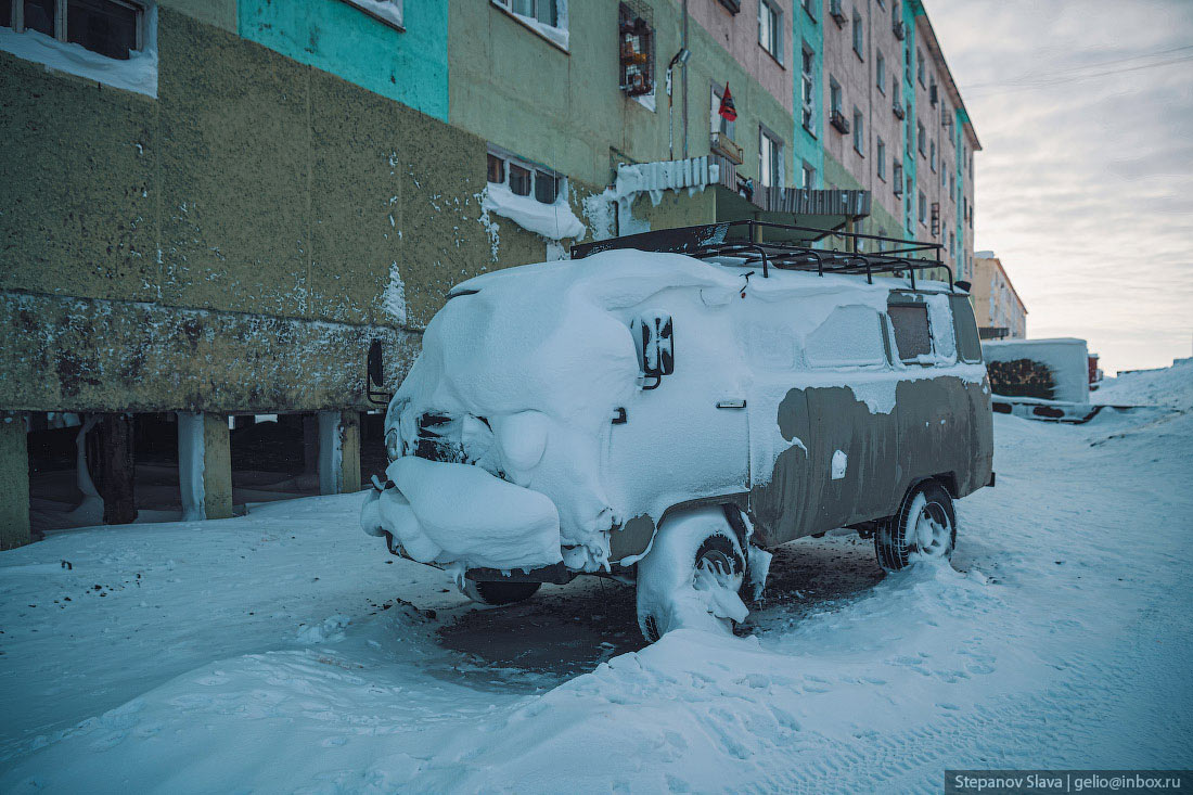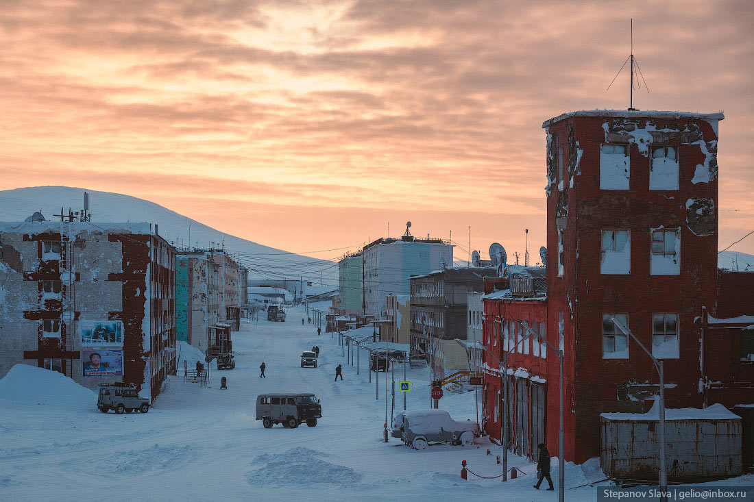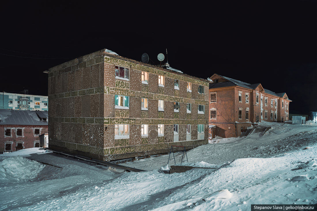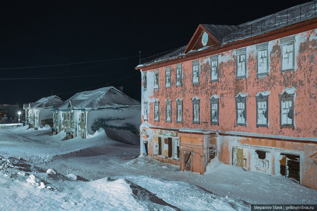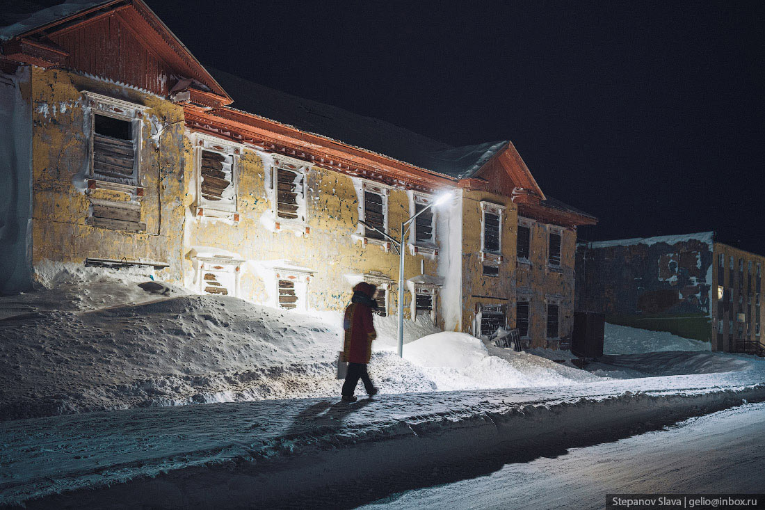 28. Самый сложный период пришелся на 90-е годы: порт переживал трудные времена, многие жители покинули посёлок, большая часть военных также ушла. В Тикси есть заброшенные здания — многие из них расселены.