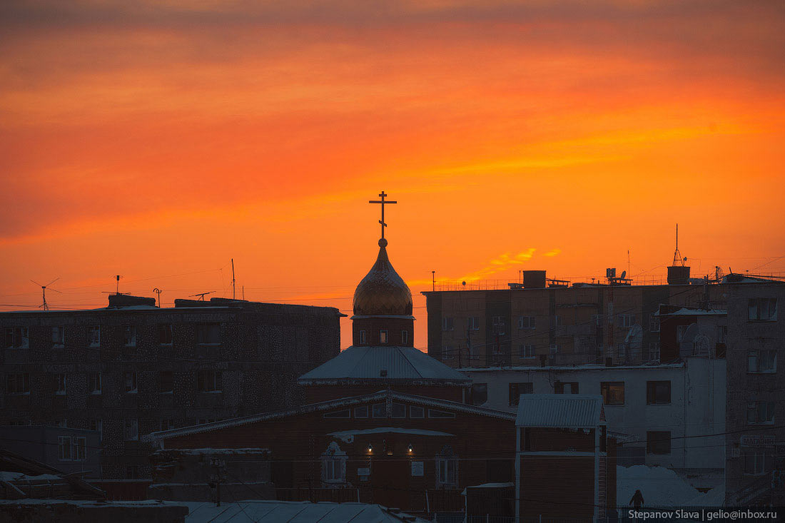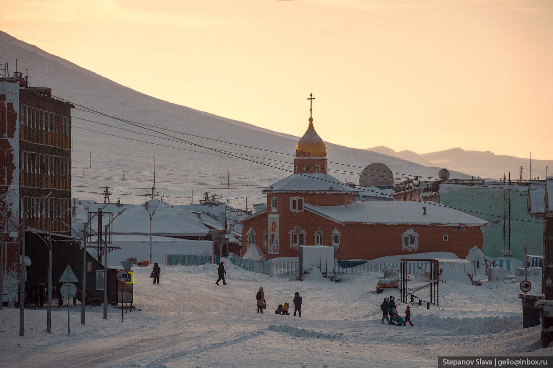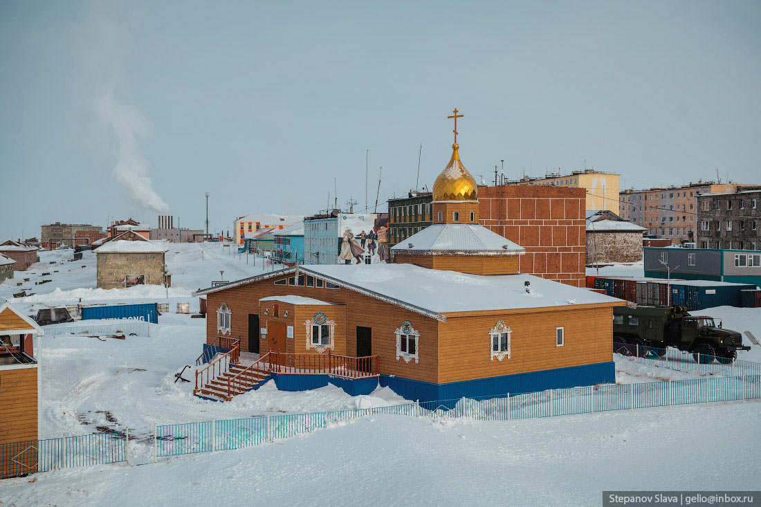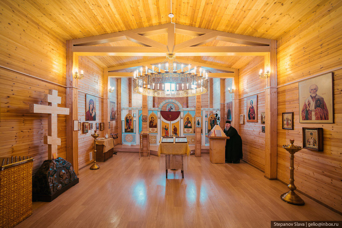 23. В 2012 году с уходом военных из посёлка аэропорт закрыли на реконструкцию и связь с большой землёй почти прервалась. Тем не менее, отец Агафангел приступил к возведению: панели для строительства доставляли из посёлка, находящегося на тысячу километров южнее, а строители, чтобы успеть до холодов, трудились по 13 часов в день без выходных. Здание церкви с жилым блоком, библиотекой, трапезной и кинозалом было построено в 2013 году и на следующий год освящено. Оно вмещало до 150 прихожан.