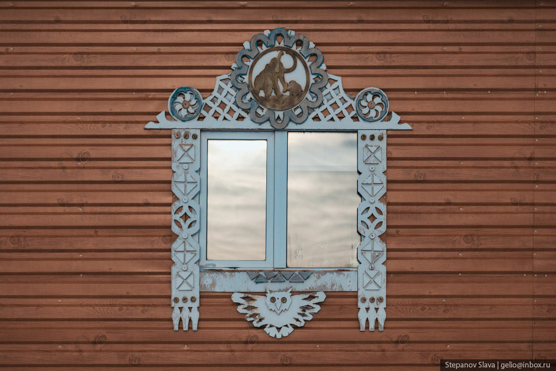 25. Резной наличник окошка церкви с изображениями мамонта и полярной совы.