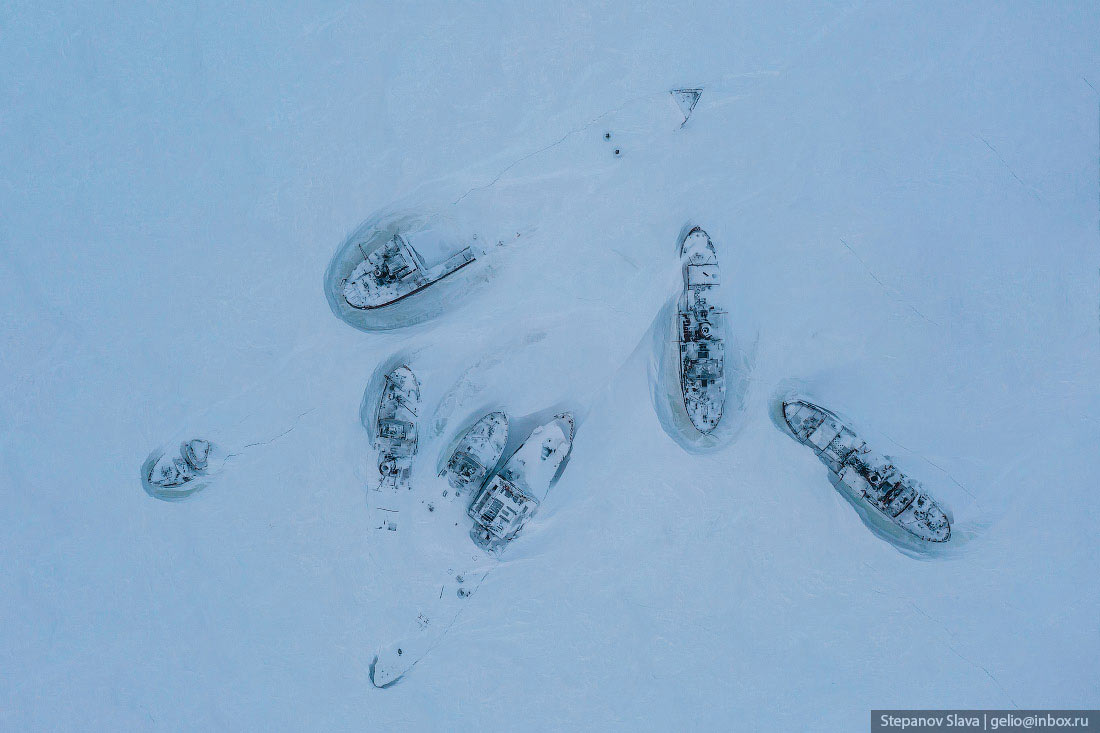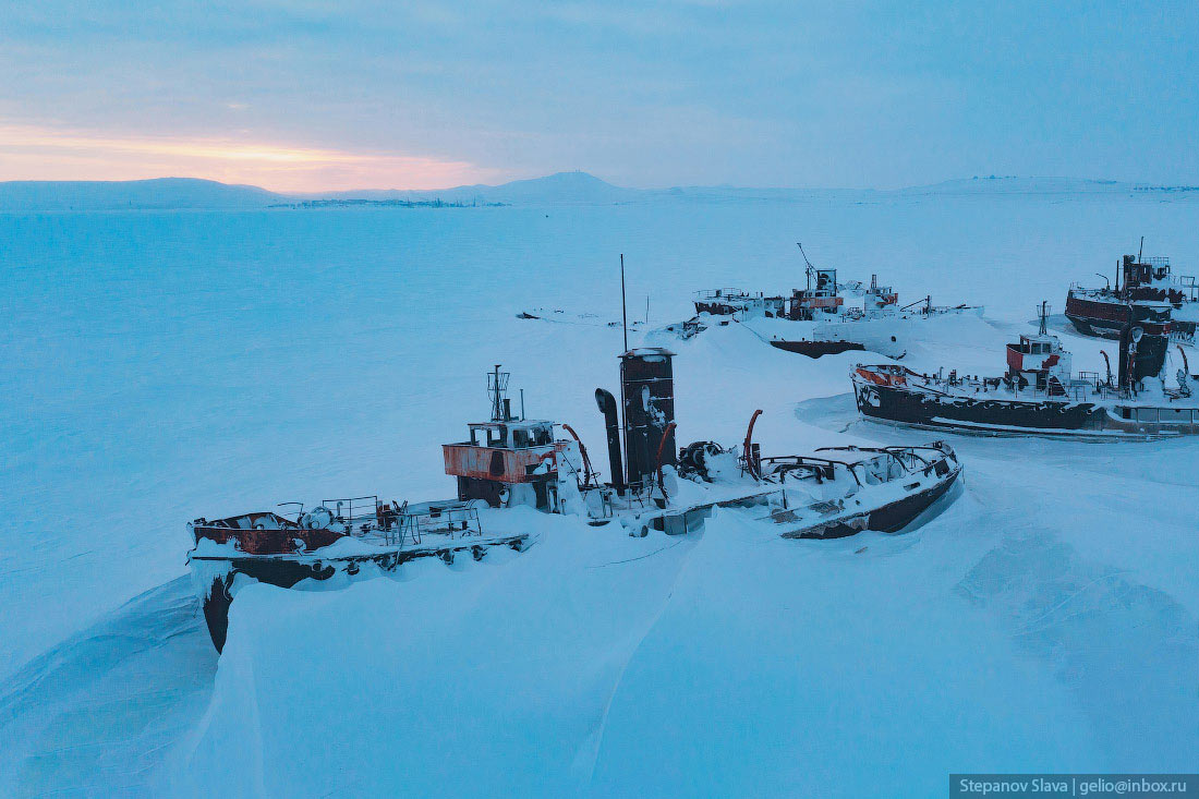 53. Кладбище кораблей на острове Бруснева — то, что осталось после отъезда на юг большей части населения Тикси после распада СССР. Огромное количество плавсредств разного назначения оказались ненужными и брошенными.