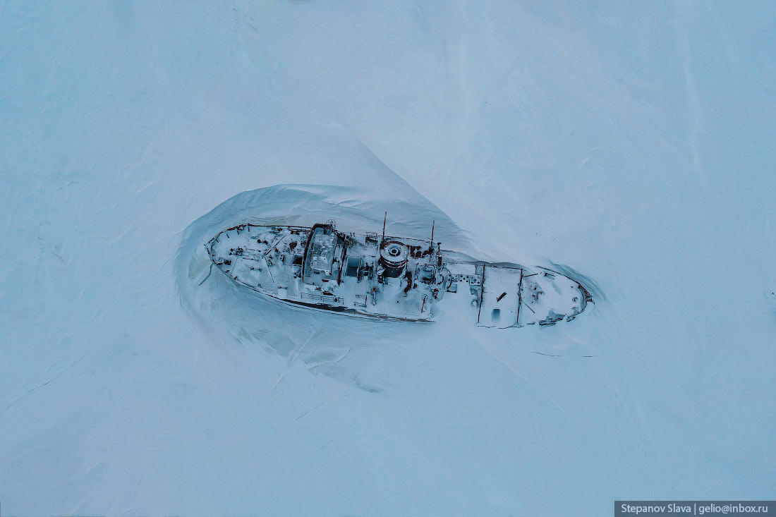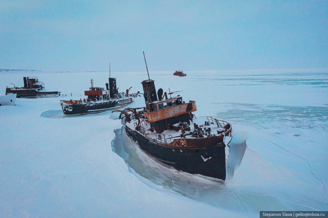 54. Справа на фото останки судна «Яков Санников», названного в честь купца и первопроходца XVIII-XIX веков, того самого, имя которого получил и загадочный несуществующий остров в Северном ледовитом океане.