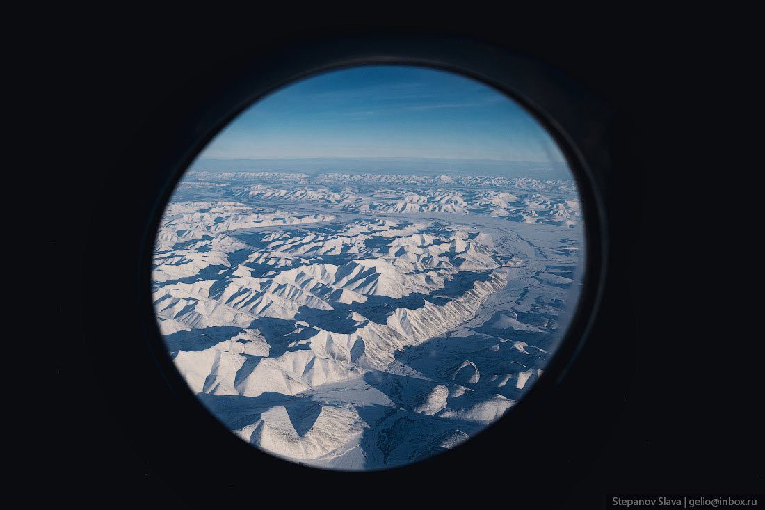 70. На пути в Якутск можно видеть Верхоянский хребет — одну из самых крупных горных систем на северо-востоке Азии, расположенную между долинами рек Лена и Яна.