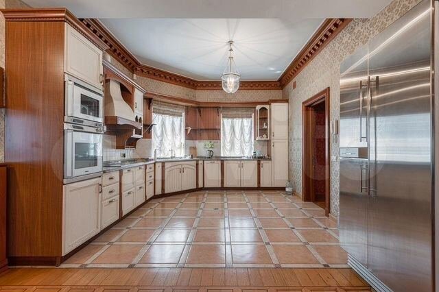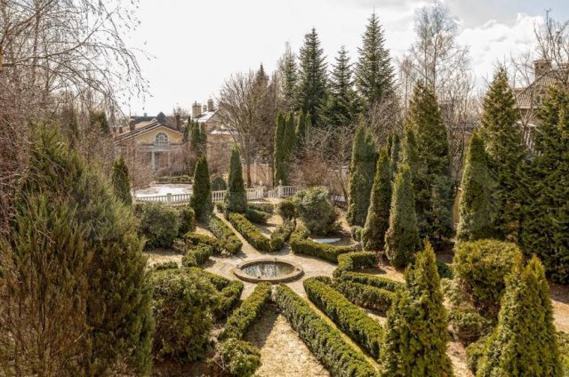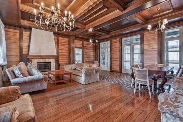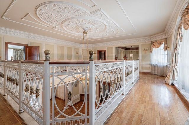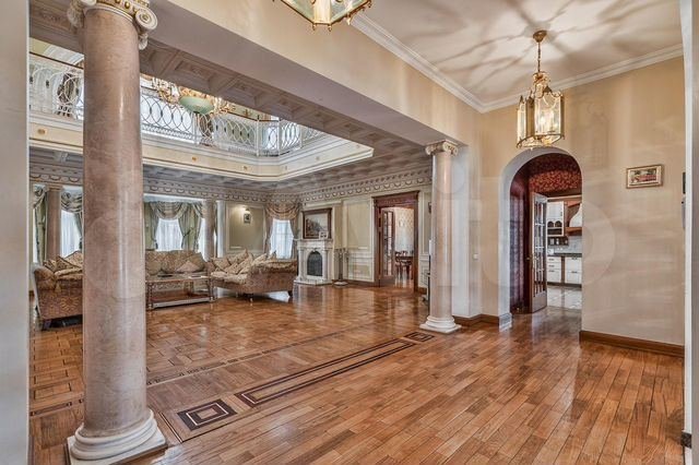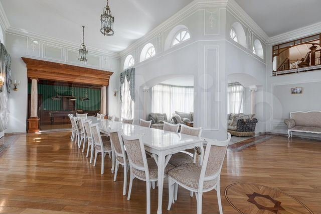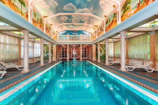 Перед нами роскошная резиденция на Рублевке, которую сдают за 35 тысяч рублей в сутки. Тут дом в 3 этажа и 1200 квадратных метров. Говорят, тут раньше устраивали банкет на 120 персон, из них несколько десятков смогут заночевать - 14 спален все-таки, где в каждой свой санузел. Есть еще огромная летняя терраса и две кухни, плюс 25-метровый бассейн, баня, сад и... всего и не упомнишь.
