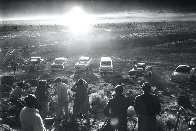 Репортеры наблюдают ядерный взрыв во время операции «Плюмбоб», 1957 год.