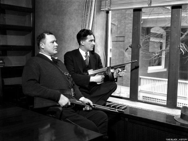 Полицейские охраняют здание суда во время процесса над знаменитым грабителем банков Джоном Диллинджером, 30 января 1934 года.