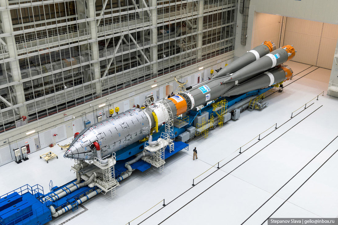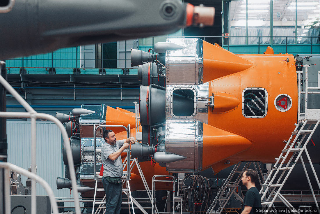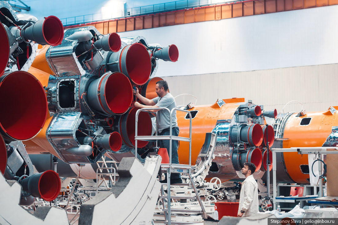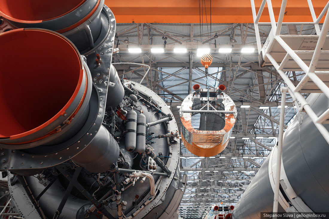17. В этом цехе все компоненты ракеты собирают в готовые ступени. Комплектующие РН доставляют сюда из других цехов завода или от поставщиков. Ракеты «Союз» собираются по «пакетной» схеме, которую предложил Сергей Королёв. К центральной второй ступени, крепятся третья ступень и четыре ускорителя. Их в шутку называют «морковками» из-за схожей формы.
