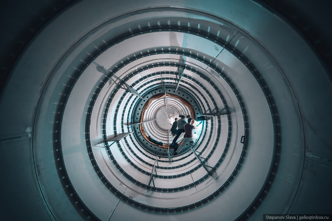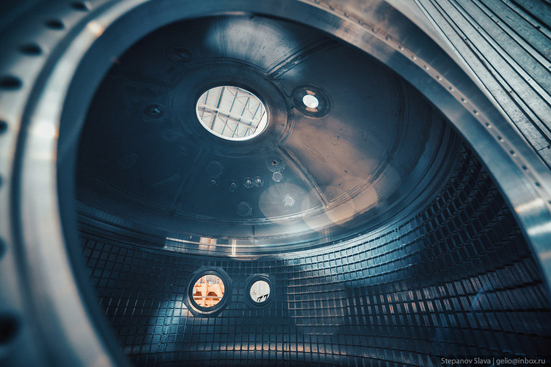 8. Топливный бак ракеты-носителя изнутри. Ракетные баки заправляют не только топливом в виде керосина, но и окислителем — жидким кислородом. Без окислителя топливо не будет гореть в атмосфере и создавать реактивную тягу.