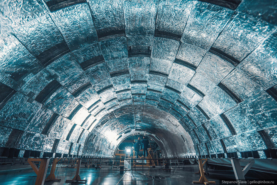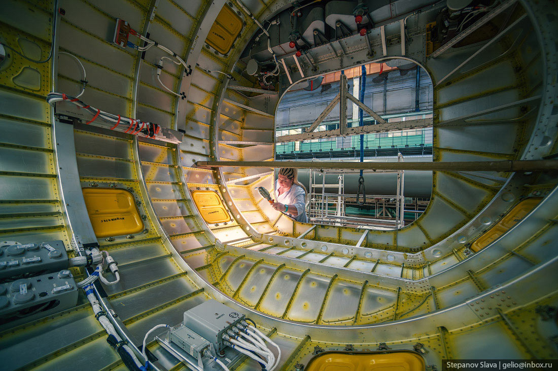 9. Вид изнутри головного обтекателя для РН «Союз-2», эти комплектующие ракеты производятся в агрегатно-клепальном цехе. Обшивка головной части состоит из десятков слоёв углеволокна и алюминиевого сотового заполнителя а между ними. Это лёгкий и очень прочный материал, который сжимается под атмосферным давлением, защищая «нос» ракеты.