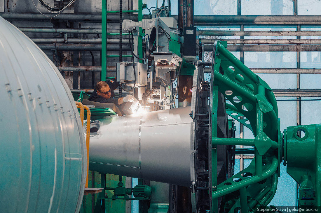 14. Заготовки бака крутятся автоматически, сварщики регулируют скорость и подачу импульса на аппарат, чтобы шов был максимально однородным и ровным.