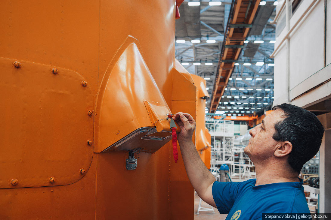 21. Всего в цехе сборки работает около 400 человек: инженеры, слесари-сборщики, изолировщики и электромонтажники. Все работы проходят вручную с помощью грузового крана. Несмотря на то, что «Союз» — серийная ракета, величина этих серий несопоставима с автомобильными и прочими. Поэтому по сути сборка РН — это штучное производство.