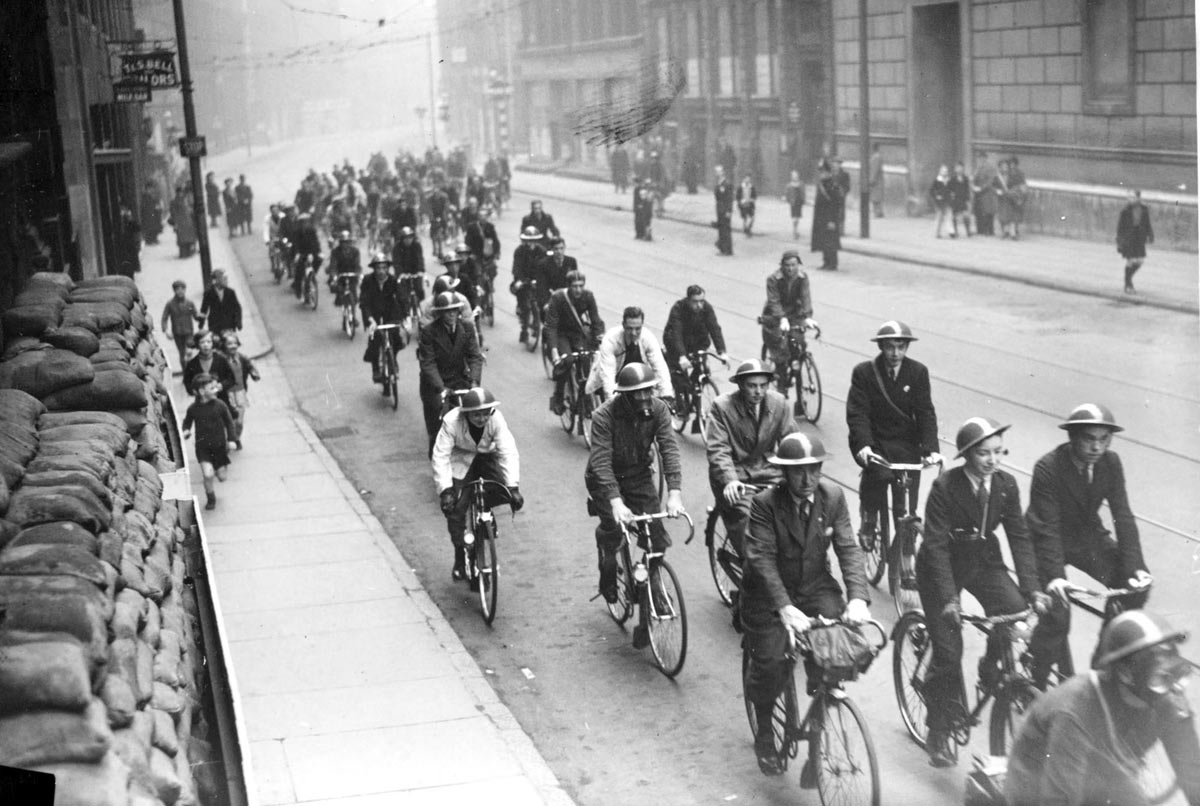 Велосипедисты-волонтеры работают посыльными ARP (Air Raid Precautions) в Ливерпуле, Англия, 1939 год. (Фото Hulton Archive):