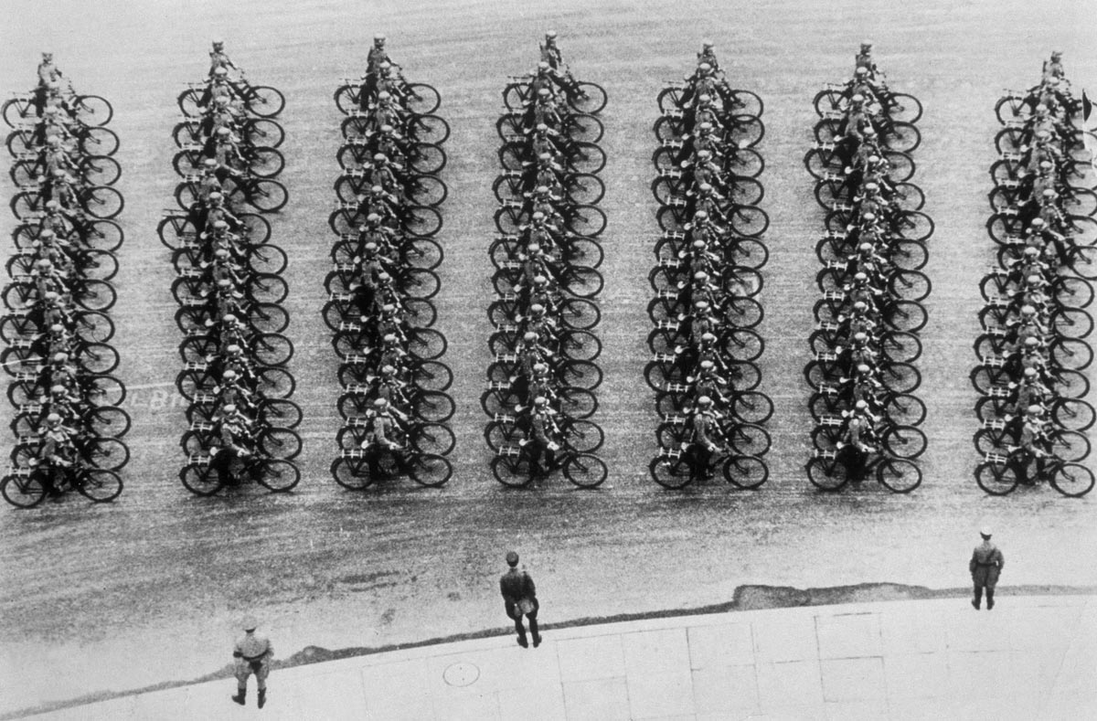 Члены немецкого велосипедного корпуса участвуют в параде 20 апреля 1939 года. (Фото Hulton Archive):