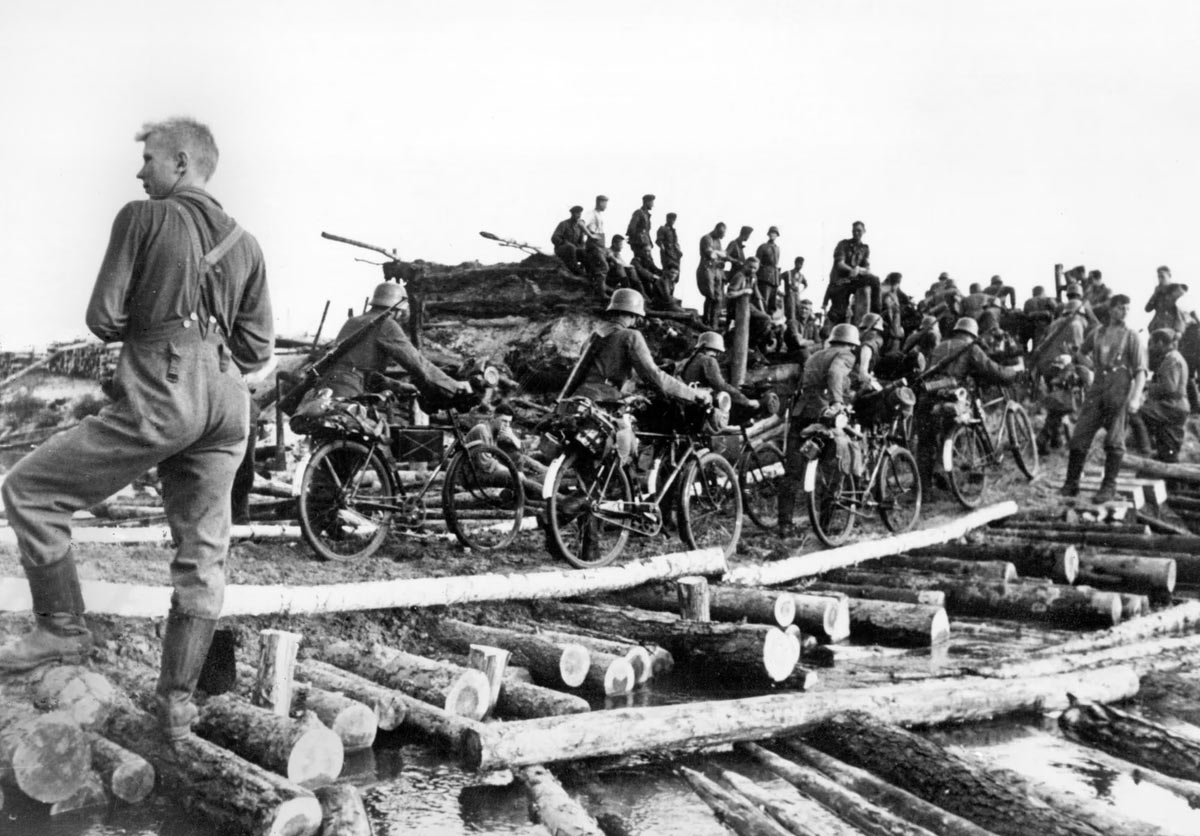 В районе Днепра на Русском фронте отряд немецких велосипедистов проезжает по бревенчатому сходу, построенному сапёрами в августе 1941 года. (Фото Heinrich Hoffmann):