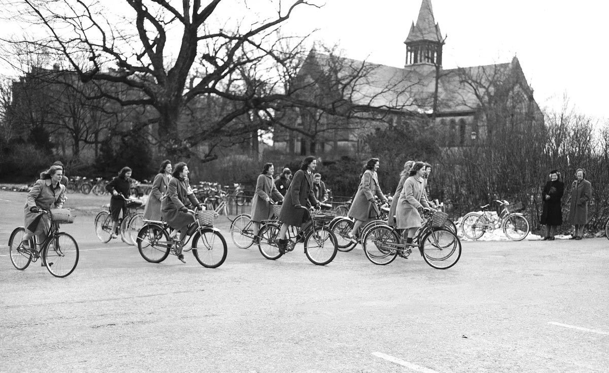 Происходит резкий рост использования велосипедов. Ограничения на автомобили, бензин шины для экономии материалов для ведения войны заставляют студентов искать альтернативные способы передвижения. Первокурсники колледжа Уэлсли едут в кампус в Уэлсли, Массачусетс, 20 марта 1942 года: