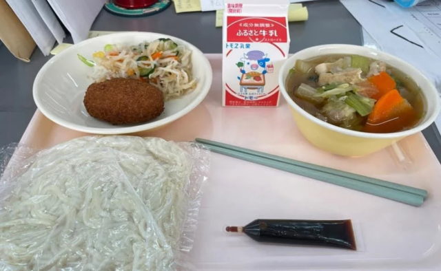 Японский обед в начальной школе. Тарелка овощного супа на первое, котлета, салат и лапша с соевым соусом на второе, и молоко на десерт — отличный сбалансированный обед.