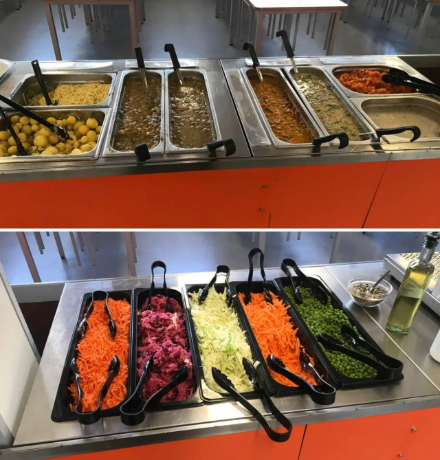 Бесплатные обеды в эстонской государственной школе. На первом фото спагетти с картофелем, курица, свинина, вегетарианское карри, соус из индейки и батат, а на втором — салаты из моркови, винегрет, пекинская капуста и горошек.