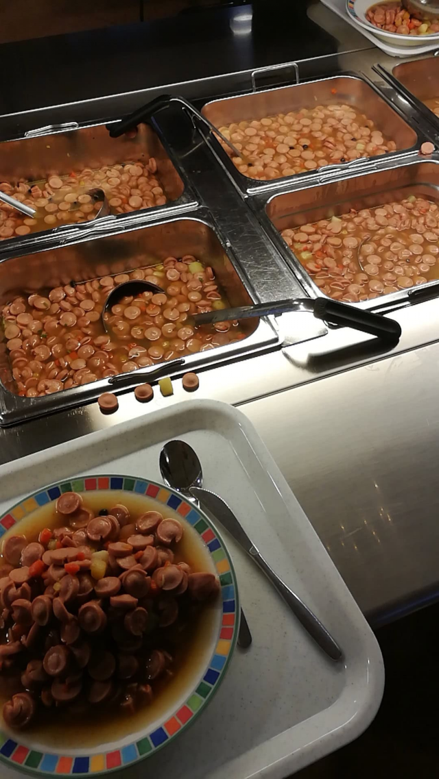 Этот суп по-венски мы ели в школе в Финляндии. В этом супе отварные сосиски, морковь и лук.