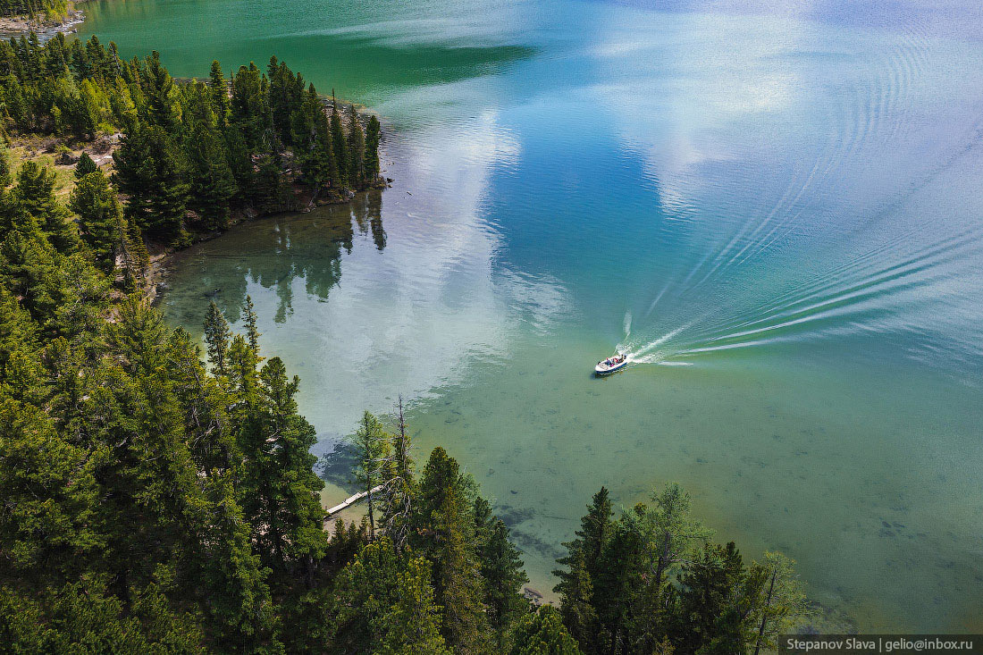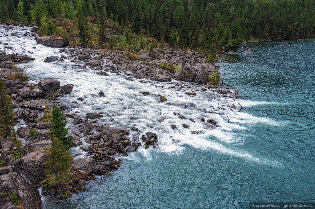 14. У туристов на Средне-мультинском, как и на Нижнем, есть возможность перебраться с одного конца озера на другой на катере — это не только открывает виды на горы вокруг водоёма, но и часто помогает сэкономить время. Однако в двух километрах от переката Шумы находится кордон Катунского заповедника — граница проходит прямо по водной поверхности. Летом там круглосуточно дежурят инспекторы.