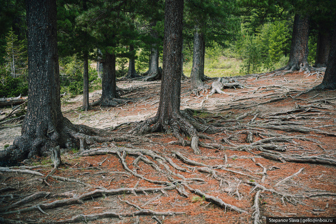 13. Корни хвойных деревьев. В целом на Мультинских озёрах типичная высокогорно-лесная флора, много кедра и лиственницы, но встречаются пихта, берёза и ива у кромки воды. Здесь также распространены луговые травы и цветы, а из редких растений здесь можно встретить несколько видов родиол, шиповник остроиглистый и копеечник чайный.