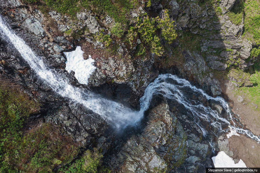 34. Водопад Куйгук устремляется с высоты 25-30 м прямо из нижнего озера. Здесь же находится ещё одна небольшая местная достопримечательность — камень, по форме напоминающий медведя, который целует девушку.