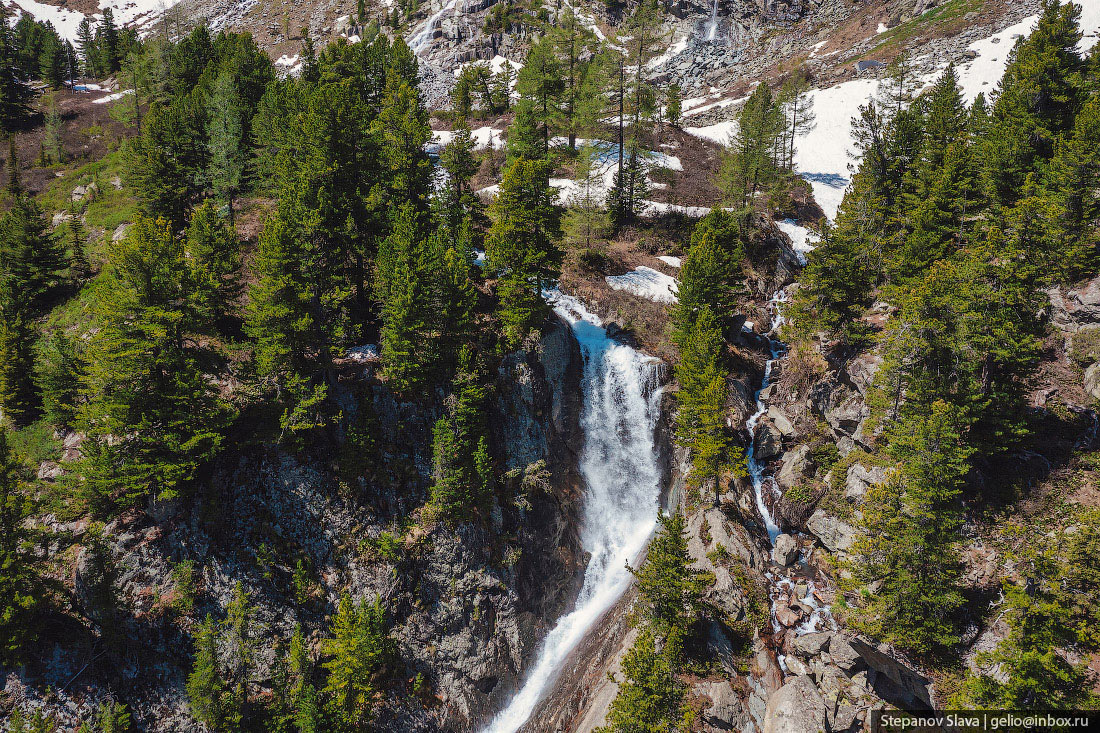 42. Название реки Куйгук, давшей имена озёрам и водопаду, по одной версии, происходит от алтайского слова «куй», что означает «пещера» или «гора», а по другой, вариант названия «куйгык» может означать горелый лес.