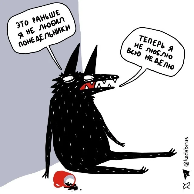 Беззаботные экстраверты, у которых стакан всегда наполовину полон - это довольно редкая порода людей. И эти вечные "позитиффчики" порой... мягко сказать, раздражают. Ведь иногда человеку свойственно нервничать, бояться, злиться, суетиться и грустить. Прокрастинация и депрессия - это слова, которые лучше всего опишут героя этого комикса. Да, он большой любитель пожаловаться на жизнь, но тем не менее каждый из нас может его понять. Давайте поддержим депрессивного волка, еще вся рабочая недели впереди...
