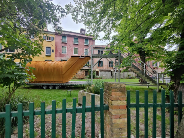 «Жёлтое сооружение высотой 3 метра с лестницей, ведущей вверх и внутрь»