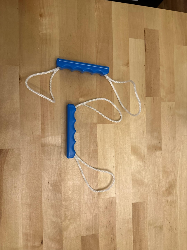 «Синие пластиковые ручки с бороздками для пальцев и белыми пластиковыми верёвочными петлями»