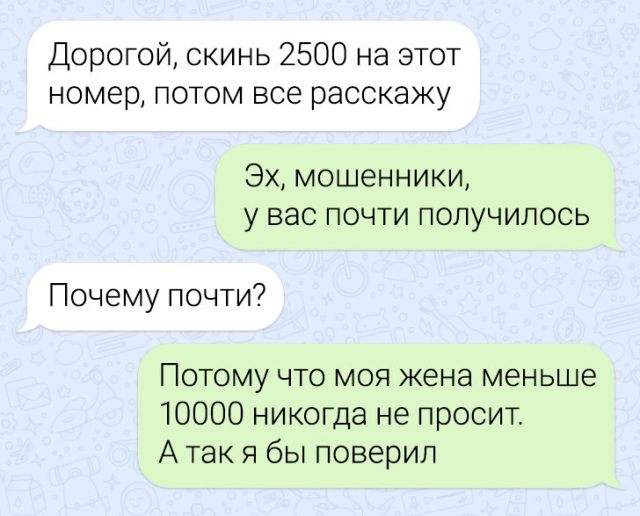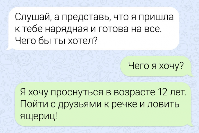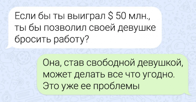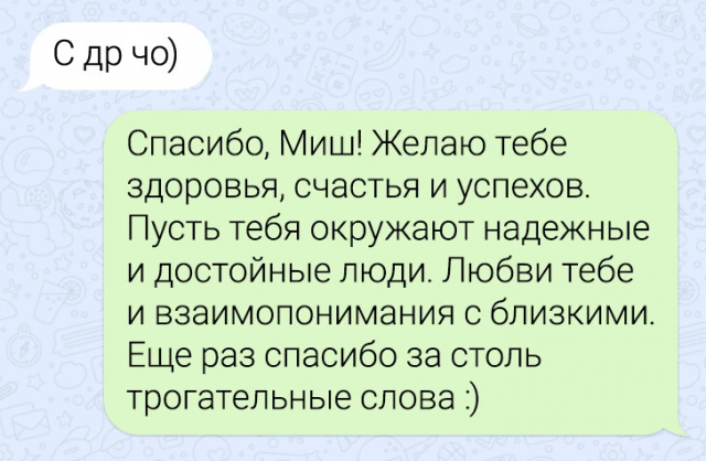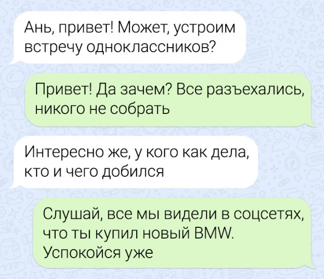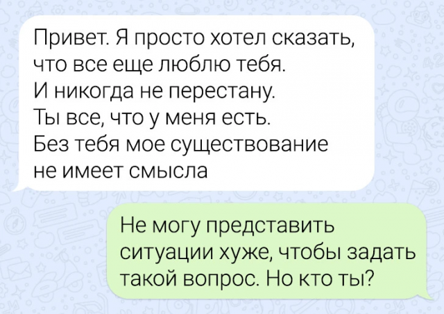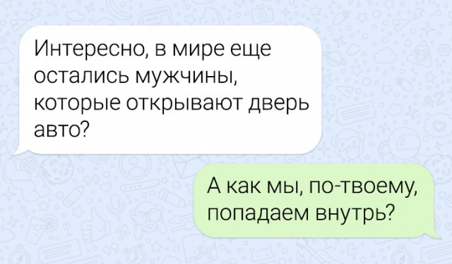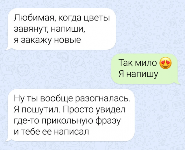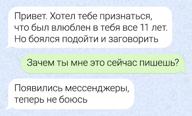 Подборка забавных переписок 12/06/2024 22:20 По СМС легче рассказать важные вещи — не придётся столкнуться с внезапными эмоциями собеседника, будет время всё обдумать. Но иногда переписка закручивается так, что кажется, будто проще поговорить с глазу на глаз. Главная / Картинки +1 Admin 0 166