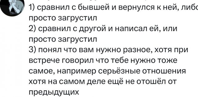 Девушка интересуется у парней, почему они могут резко выйти из отношений 18/06/2024 16:00 В соцсетях очередной опрос - девушка решила поинтересоваться, почему многие парни в самый ответственный момент сливаются из отношений. И получила необычные ответы. Главная / Картинки 0 Admin 0 346