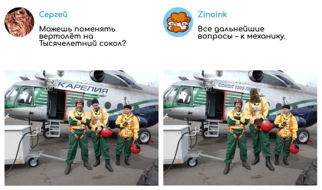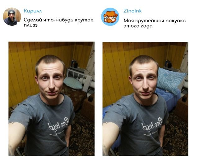 Мастер фотошопа Zinoink снова в деле. Этот парень остроумно и забавно выполняет просьбы своих подписчиков, которым что-то нужно исправить на снимке. Результаты всегда превосходят их ожидания, ибо художнику виднее! Всем веселого просмотра.