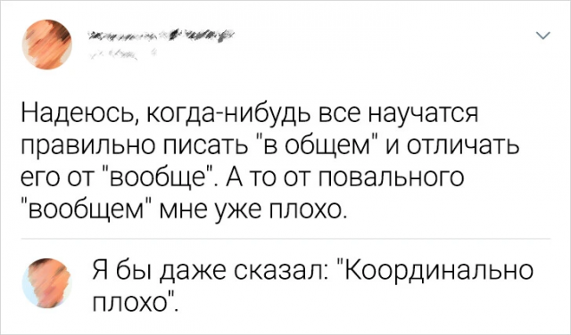 Подборка забавных комментариев 24/06/2024 22:40 Герои этого поста никогда не теряют нить разговора и могут моментально отреагировать на любую фразу так, что вы либо расхохочетесь, либо расплачетесь. Мы выбираем первый вариант. Итак, милости просим к просмотру. Главная / Картинки +1 Admin 0 143