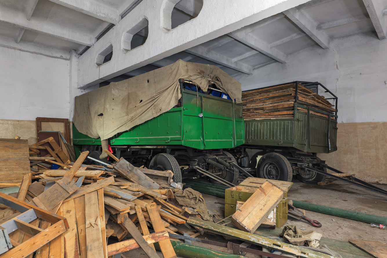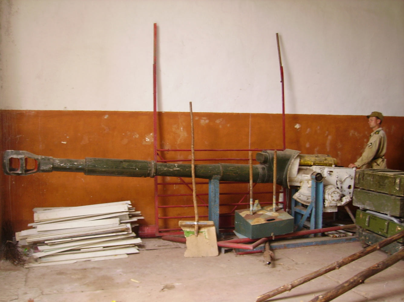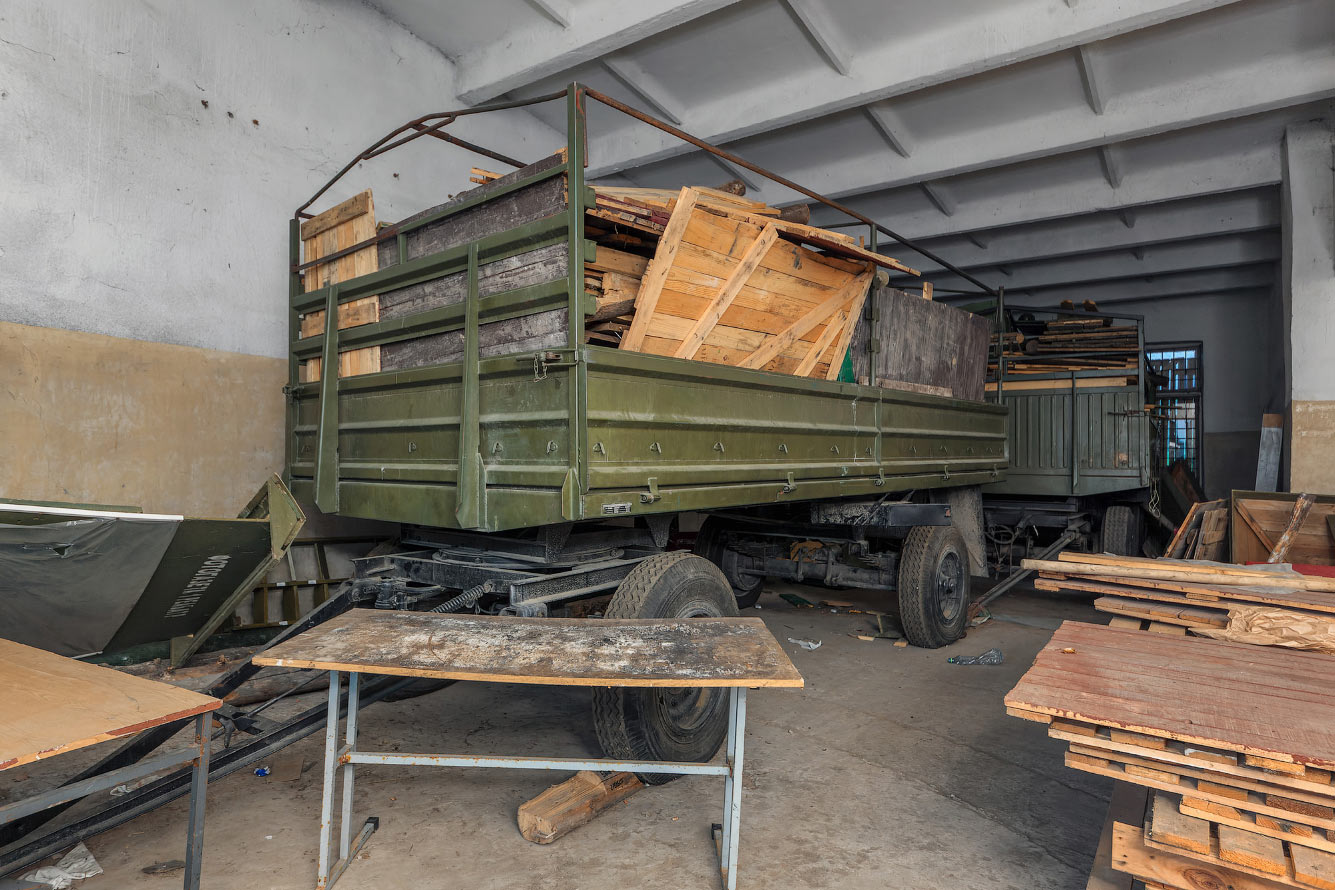 Рядом с орудием в гаражных боксах стояло несколько больших военных прицепов набитых всяким хламом.