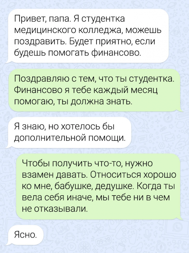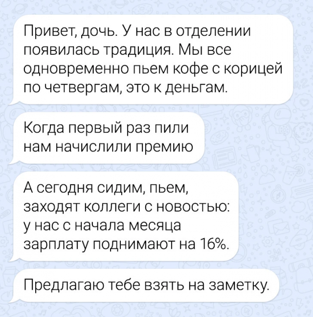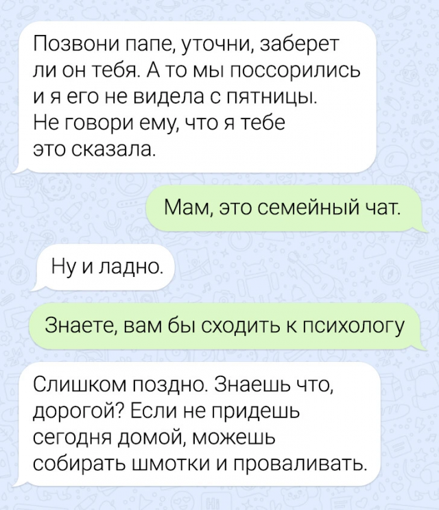 Забавные диалоги с родителями 02/07/2024 23:30 Общение с родителями - это самостоятельный и глубокий жанр! В процессе мы испытываем весь спектр чувств. От нежности до истерического припадка. Но зато скучно никогда не бывает! Главная / Картинки +2 Admin 0 200