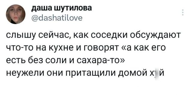 Подборка забавных твитов обо всем 03/07/2024 18:00 Вот и новая подборка забавных твитов. Самое время устроить себе маленький перерыв и поднять настроение. Так что всех милости просим в пост! Желаем веселого просмотра. Главная / Картинки 0 Admin 0 215