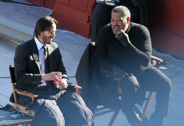 Киану Ривз и Лоуренс Фишборн бурно обсуждают что-то на съемках «Джона Уика»