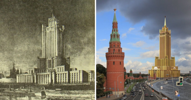 Самый высокий из сталинских небоскрёбов (275 предполагаемых метров) так и не был достроен из-за смерти Сталина в 1953 году. В 1960-х начатый небоскрёб преобразовали в гостиницу «Россия».