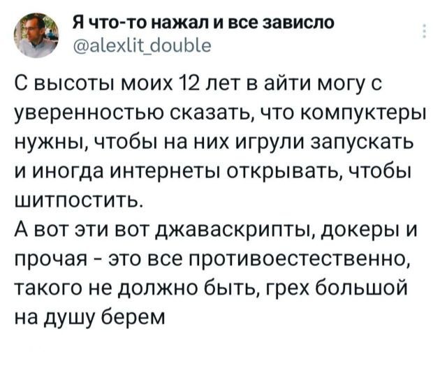 Подборка забавных твитов обо всем 10/07/2024 20:00 Вот и новые забавные твиты. А это значит, что ближайшие пару минут пролетят весело и быстро. Так что всех милости просим в пост. Желаем приятного просмотра! Главная / Картинки +2 Admin 0 161