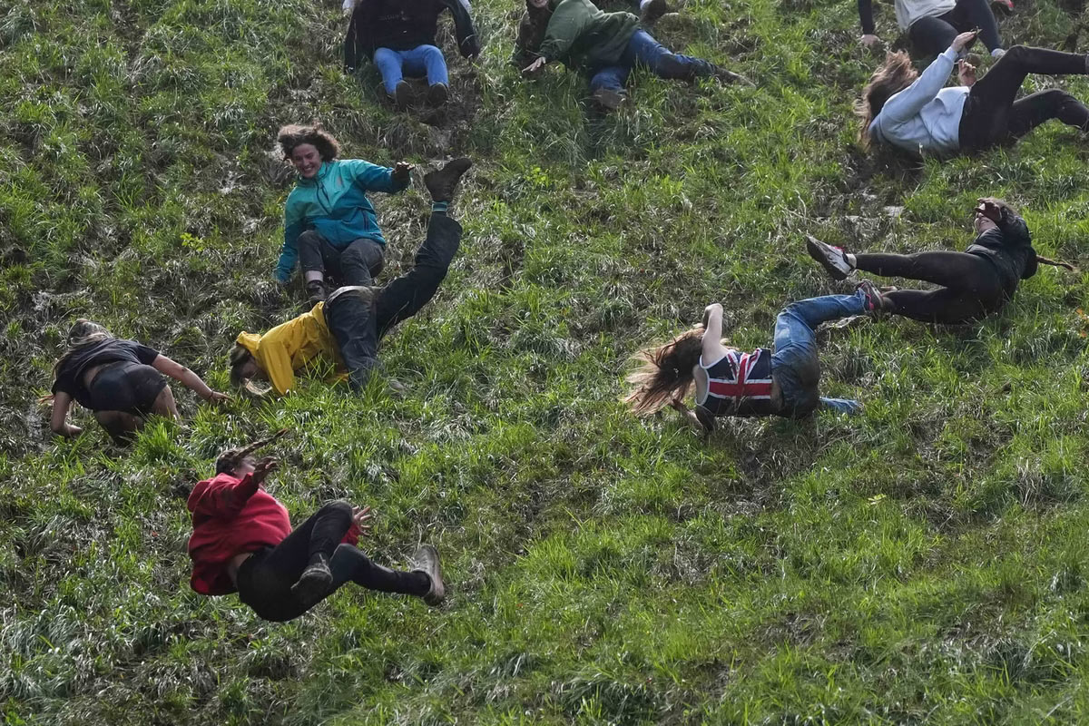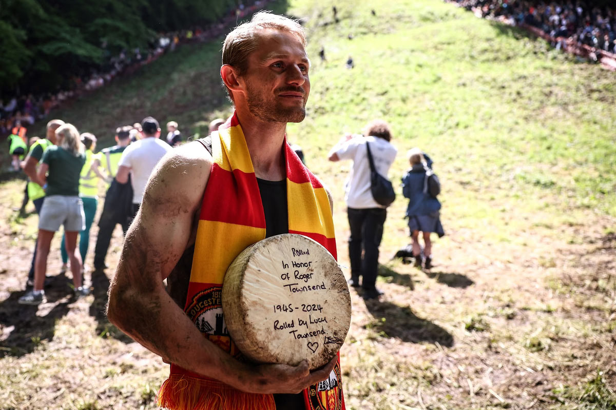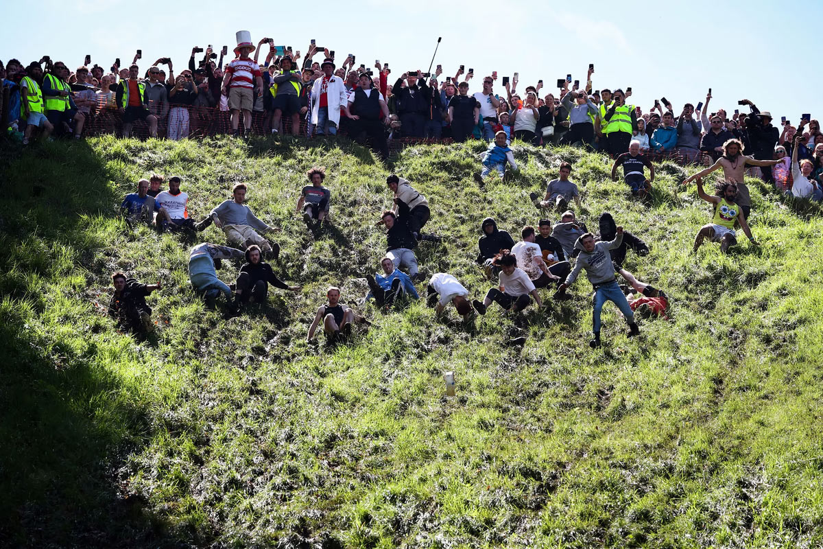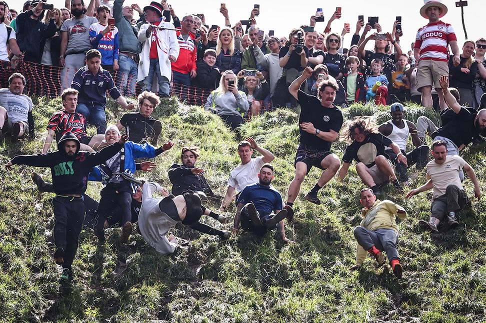Куперсхиллская сырная гонка (Cooper’s Hill Cheese-Rolling Race 2024). Участники соревнования находятся на вершину холма и ожидают сигнала. Затем по склону бросают вниз головку сыра Глостер, за которой бросаются в погоню все участники. Кто поймал, тот и победил. Если не сломал себе голову.