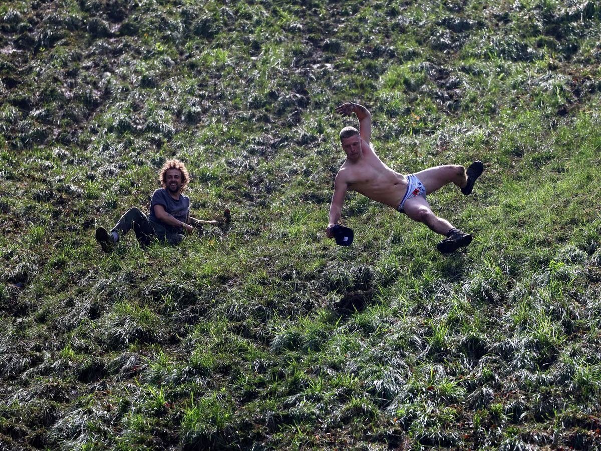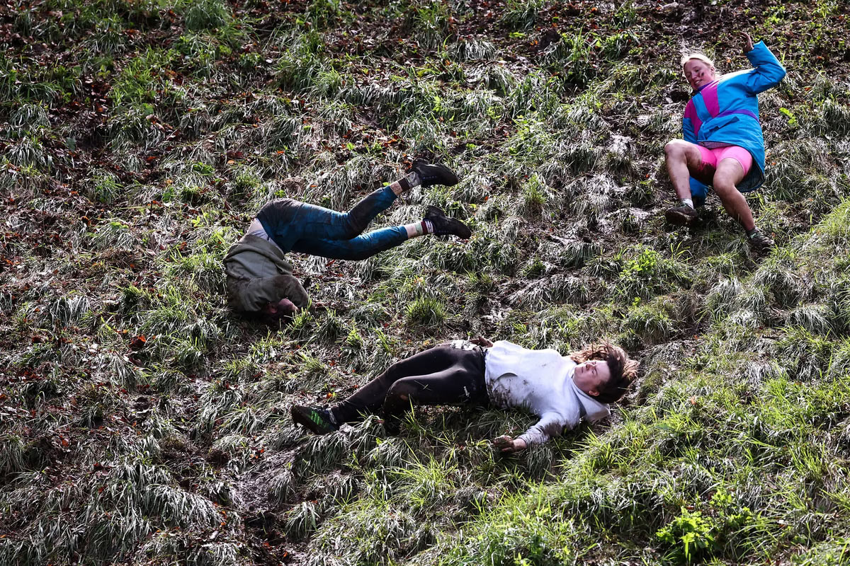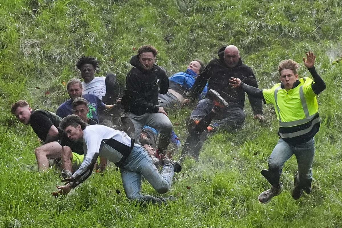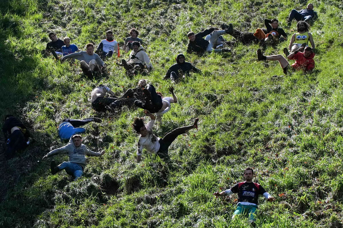 Куперсхиллская сырная гонка (Cooper’s Hill Cheese-Rolling Race 2024). Участники соревнования находятся на вершину холма и ожидают сигнала. Затем по склону бросают вниз головку сыра Глостер, за которой бросаются в погоню все участники. Кто поймал, тот и победил. Если не сломал себе голову.