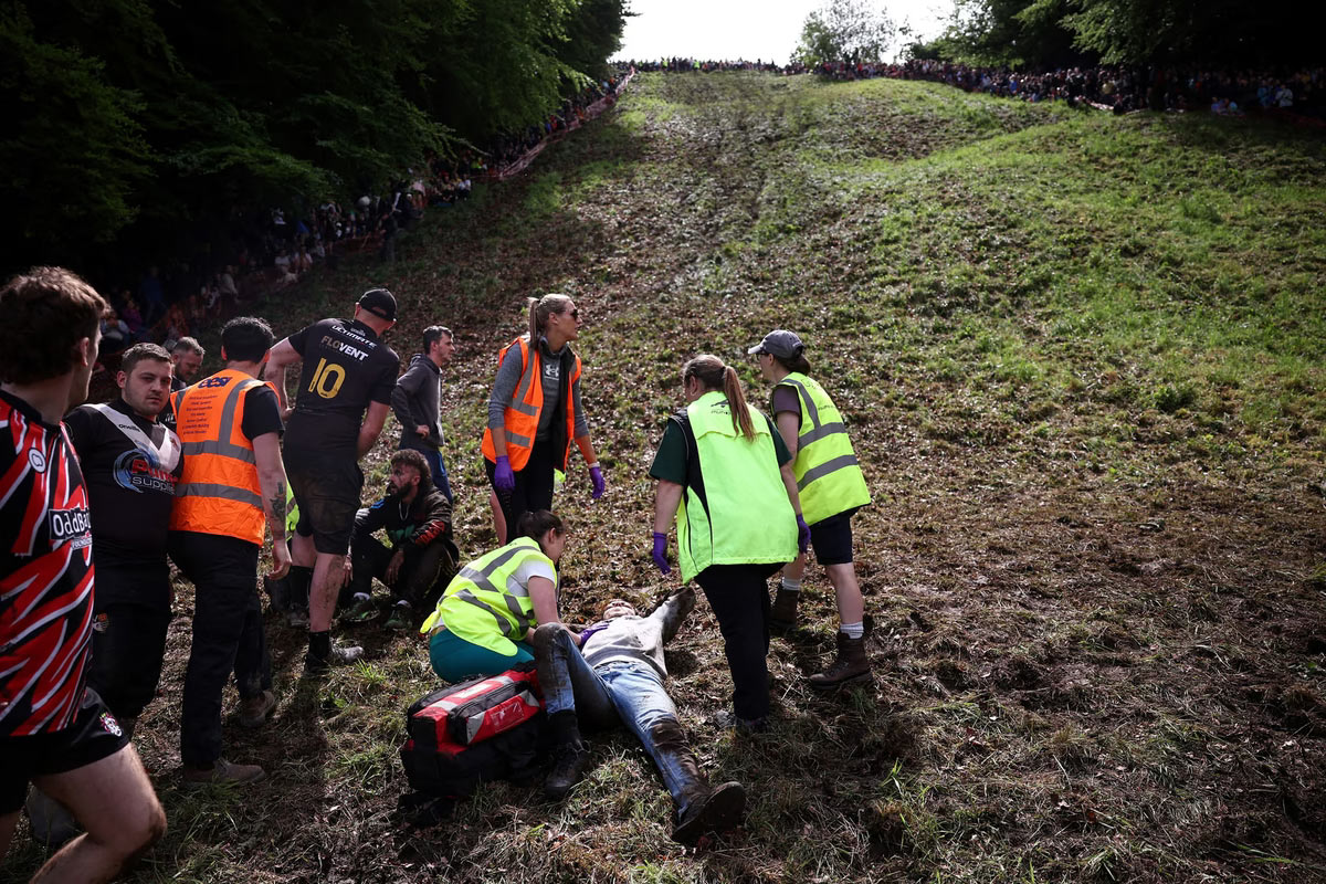 Из-за крутизны и неровной поверхности холма Купера, как правило, ежегодно происходит ряд травм. У подножия холма в день соревнования обязательно дежурят несколько карет скорой помощи и бригада спасателей. (Фото Henry Nicholls):