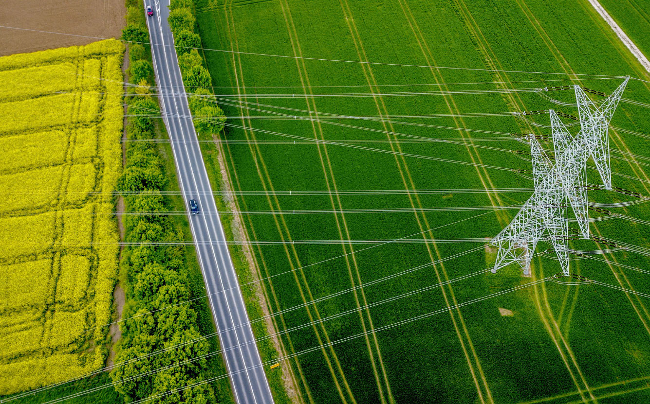 Столб электропередачи стоит на поле на окраине Франкфурта, Германия. (Фото Michael Probst):