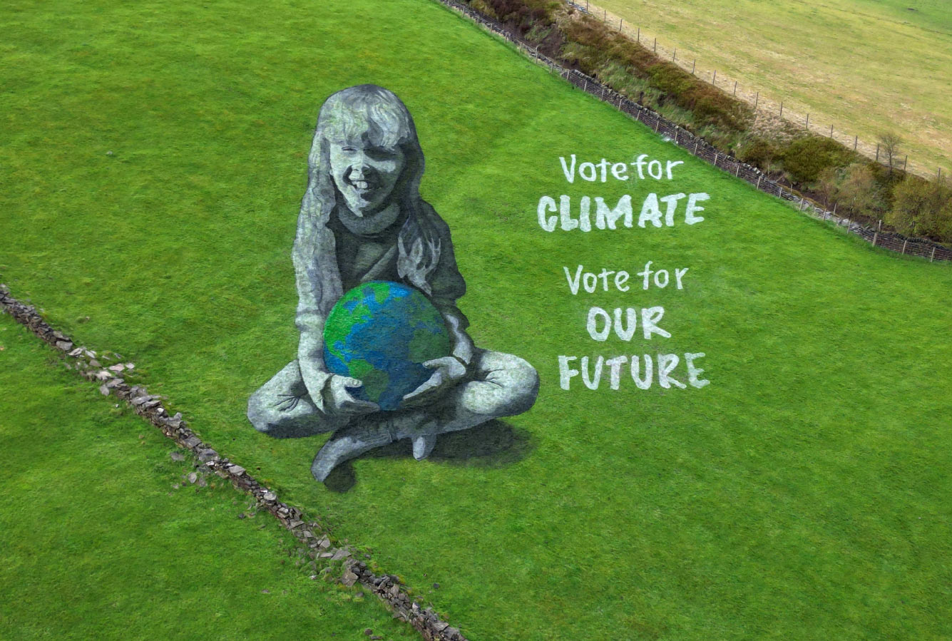 Снимок с дрона крупномасштабного произведения местных художников «Песок в твоем глазу», на котором изображена девочка, держащая Землю в честь Дня Земли. (Фото Molly Darlington):