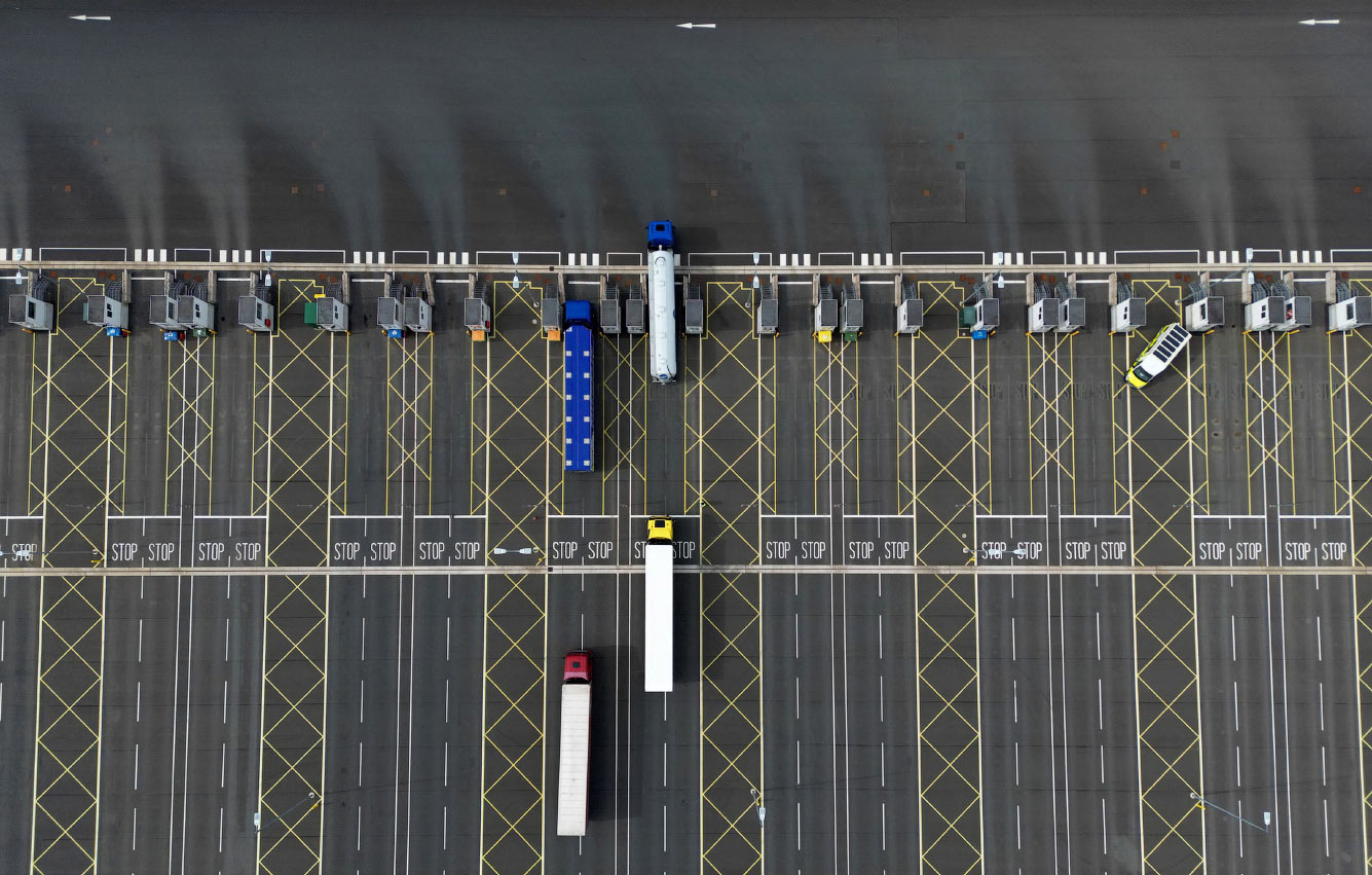 На аэрофотоснимке видны фуры, припаркованные на пограничном пункте Севингтон на юго-востоке Англии. (Фото Ben Stansall):