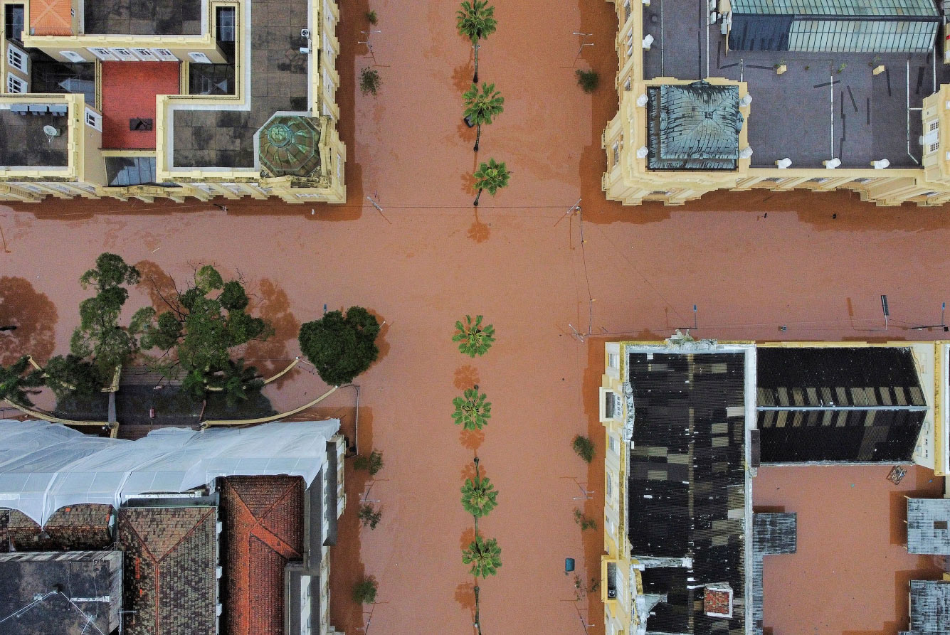 Снимок с дрона показывает затопленный центр города после эвакуации людей в Порту-Алегри, Риу-Гранди-ду-Сул, Бразили. (Фото Renan Mattos):